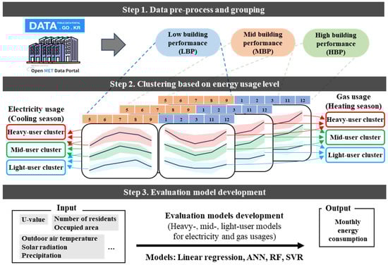 Figure 1 illustrates the methodology for developing evaluation models of building energy usage for inducing saving. This is structured into the following three steps: (1) data preprocess and grouping; (2) clustering based on energy usage level; and (3) evaluation model development.