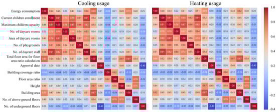 A correlation analysis was performed to examine key factors influencing energy consumption (electricity and city gas). The relationships between the monthly energy consumption and 14 input variables from the collected public data (Table 1) were examined using the Spearman correlation coefficient method. The monthly correlation results for electricity consumption during the summer months (May, June, July, August, and September) and gas consumption during the winter months (January, February, March, November, and December) were obtained. Figure 2 illustrates the monthly average values; positive values indicate a direct relationship between the input and output variables, while negative values represent an indirect relationship. The physical attributes of the buildings, such as floor area, building size, and building height, exerted the greatest influence on energy consumption. Other moderately influential factors included the number of day-care staff and building height, both showing consistent positive correlations. In contrast, the building coverage ratio showed a negative correlation, indicating an indirect relationship; however, it had minimal influence, with correlations close to zero. The GFA for FAR calculation had the strongest impact on energy consumption. Consequently, this study adopted it as the basis for normalizing energy consumption data. In other words, each monthly energy consumption value was divided by the corresponding GFA for FAR to obtain a more intuitive variable.