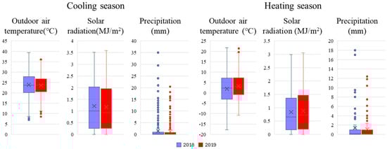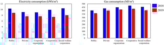 Figure 3 depicts the normalized annual electricity and gas usage per GFA for FAR calculation in 2018 and 2019. The data from all buildings (Table 2) were averaged by day-care center type. Evidently, the normalized energy usage is relatively consistent across different organizational types of day-care centers. Moreover, discrepancies between 2018 and 2019, mainly due to weather conditions, are evident in Figure 4 and Table 3. During the cooling season in 2018, the OAT, solar radiation, and precipitation were higher, leading to increased cooling energy usage. Conversely, during the heating season in 2018, the OAT and solar radiation were lower, while the precipitation was higher, resulting in increased heating energy consumption. This underscores the importance of incorporating weather variables into the development of evaluation models.
