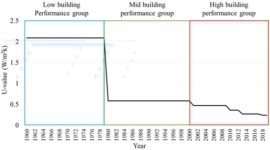 As aforementioned, the normalized data were grouped into three building performance categories—LBP, MBP, and HBP—based on the U-value, an indicator of the thermal transmission efficiency of the building envelope. This value typically decreases as the regulations become increasingly stringent under governmental policy. In South Korea, the U-value remained constant for several decades and was dramatically reduced in 1980. It then remained unchanged for nearly two decades and began to decrease consistently after 2000. This trend is illustrated in Figure 5, which shows the building performance grouping based on the U-values of external walls.
