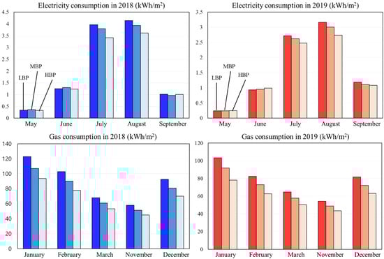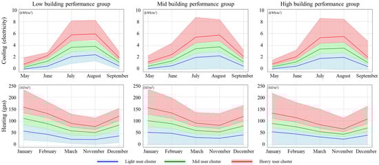 Electricity and gas energy consumption by each group (low, mid, and high building performance groups).