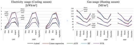 This subsection describes the process of developing the evaluation models of building energy usage. The modeling is based on the averaged monthly trajectories of energy usage in each cluster. This entails the use of input variables related to the building performance, building characteristics, and weather condition. LR and various machine-learning models including ANN, RF, and SVR were examined.
