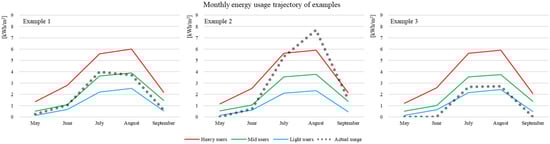 Figure 7 depicts the results of the clustering. The top three plots show the results for electricity consumption, while the bottom three show those for gas consumption. The colors red, green, and blue represent higher, mid, and light users, respectively. The shaded areas indicate the clustered data points, while the lines represent the average trajectories of the clusters. We pre-processed the data by applying the IQR (Interquartile Range) and averaged them to find the representative monthly trajectory of each cluster. While the median can be considered, in most cases, the data is not evenly distributed in each cluster, so the average value can be more representative.