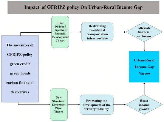 The theoretical framework underpinning our analysis of the GFRIPZ policy rests on three complementary channels. First, the double dividend hypothesis in environmental economics provides the normative foundation by demonstrating that institutional arrangements designed for environmental protection can also generate economic benefits through improvements in ecological quality and resource allocation efficiency [34]. Second, New Structural Economics offers the structural transformation perspective, arguing that green finance alleviates rural credit constraints, leverages local factor endowments, and directs industries toward higher value-added and environmentally friendly activities in rural areas [35]. Third, Pigou’s welfare economics contributes to the redistributive mechanism by emphasizing externality internalization and ecological compensation; this channel corrects the environmental harms transferred from urban to rural regions and produces compensatory income flows that benefit rural households [36]. By integrating these three channels, our framework posits that the GFRIPZ policy enhances environmental outcomes, accelerates rural industrial upgrading, and reallocates income in favor of rural areas, thereby reducing the income gap between urban and rural areas. Based on this integrated reasoning, we propose the following hypothesis.