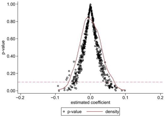 Building upon the confirmation of parallel trends, a placebo test was performed to exclude the possibility that the baseline results were driven by random shocks or unobserved confounders. By randomly assigning treatment status to cities and re-estimating the baseline model 500 times, the distribution of placebo coefficients clustered tightly around zero with most p-values exceeding 0.1, as shown in Figure 3. This contrasts sharply with the significant negative coefficient (−0.252) obtained in the actual baseline regression, reinforcing the conclusion that the observed policy effect is not a spurious artifact but a genuine causal impact.