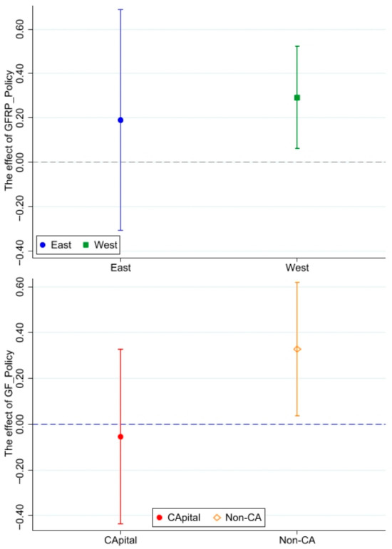 Another critical dimension of heterogeneity arises from differences in cities’ administrative ranks, which reflect variations in scale, resource endowment, and institutional capacity that may influence the GFRIPZ policy’s effectiveness in reducing urban-rural income disparities. To explore this, the sample is split into provincial capital cities and non-provincial capital cities for subgroup regression analysis. The results, reported in Table 10 (Model 17 and Model 18) and Figure 4, show that while the GFRIPZ policy coefficient is negative in non-provincial capital groups, it is statistically significant only in non-provincial capital cities.