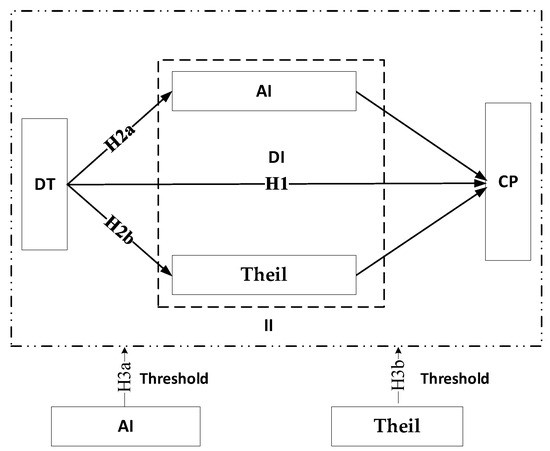 Mechanisms of digital technology in empowering farmers to achieve common prosperity. “DT” stands for “Digital technology”, “CP” stands for “Common prosperity of farmers”, “AI” stands for “Farmer’s income”, “Theil” stands for “Income gap·between·urban·and rural areas”, “DI” stands for “Direct impact”, “II” stands for “Indirect impact”, “Threshold” stands for “The Nonlinear Effect”.