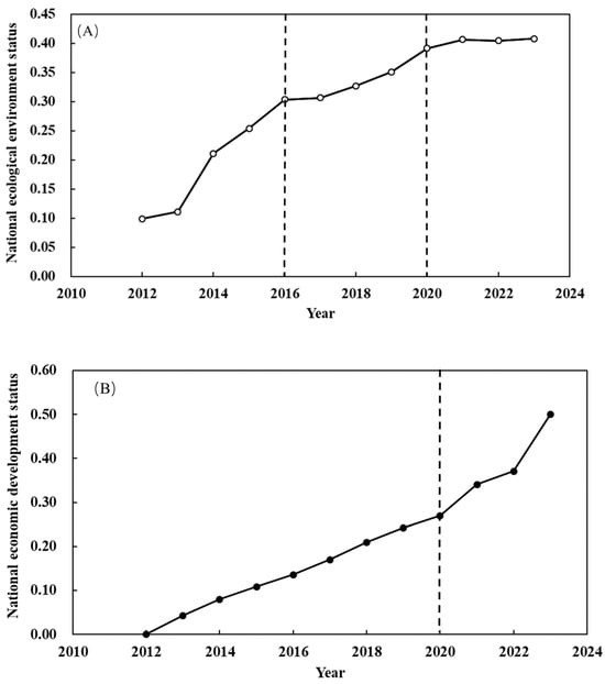 National ecological environment (A) and economic (B) development status. The dashed lines indicate the critical thresholds between different development states.