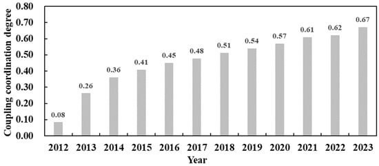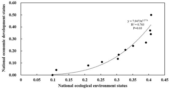 A significant power-law correlation was observed between the scores of the ecological environment and the economy (R2 = 0.76, p = 0.03; Figure 2), indicating that environmental quality is positively associated with economic growth. D increased over the study period (Figure 3). Before 2014, D was relatively low. Medium D was reached in 2015, and a good coordination level was reached in 2021.