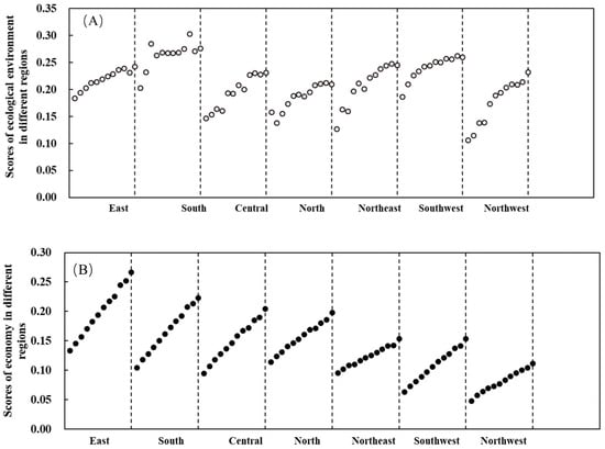 Comprehensive evaluation scores of ecological environment (A) and economy (B) in different regions.