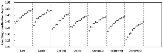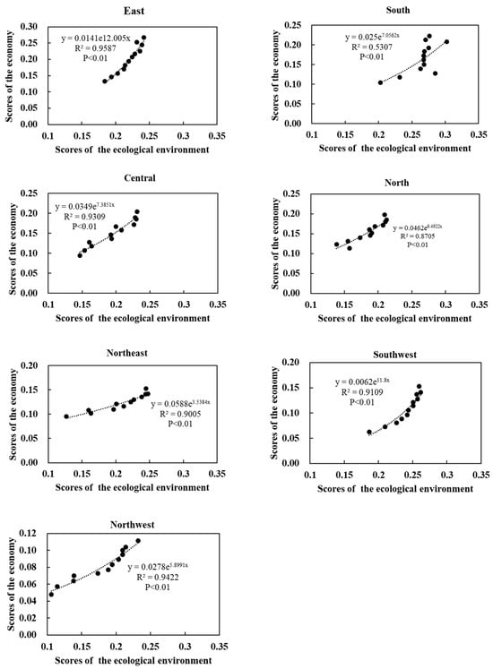 Significant exponential correlations were observed in the evaluation scores in the seven geographical regions (Figure 5, p < 0.01). The correlation coefficients were greater than 0.9 for all regions, except for North China (0.87) and South China (0.53). D increased in each region from 2012 to 2023 (Figure 6). D values in the seven geographical regions were divided into four groups. The highest degree of coupling and coordination was observed in South and East China, followed by Central China (second echelon); North, Northeast, and Southwest China (third echelon); and Northwest China (fourth echelon). Transitions from low to medium coupling and coordination in the study period were observed for the first three echelons. Low coupling and coordination were still observed for Northwest China at the end of the study period, but a transition to medium coupling and coordination is imminent. These findings indicate that the “Two Mountains” concept has had a positive impact.