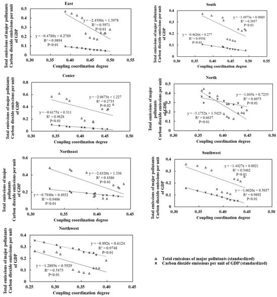 Major pollutants and carbon dioxide emissions in all regions were strongly negatively correlated with D (p < 0.01, Figure 8). Reductions in major pollutants had the most significant effect on the coupled development in North China; the slope (k = −3.18) and correlation coefficient (R2 = 0.66) in the linear regression equation were highest for the North China region. In contrast, small slopes and correlation coefficients were observed in the linear regression equations for the Northwest, Southwest, and South China regions, indicating that reductions in major pollutants in these regions have a relatively smaller effect on coupled development; other regions fell in between these extremes. Similarly, reductions in carbon emissions had the strongest effect on the coupled development in North China, as the largest slope (k = −1.05) and correlation coefficient (R2 = 0.61) in the linear regression equation were observed for this region. This was followed by the Southwest region and then the East China and South China regions, indicating that carbon emissions have a relatively smaller effect on the coupled development in these regions; other regions fell in between these extremes.