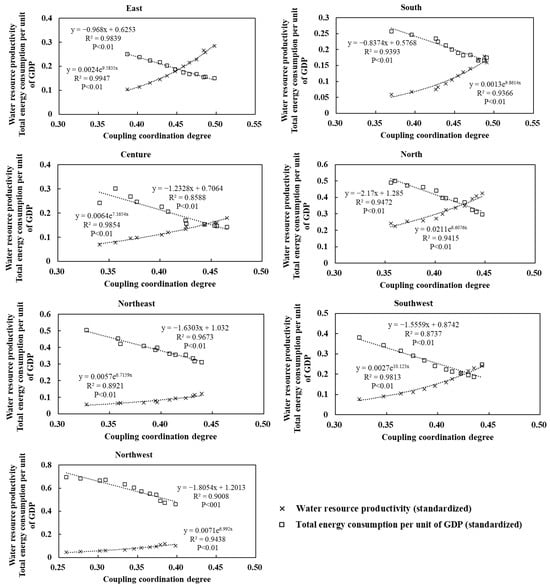 The water resource productivity in each region was strongly exponentially correlated with D (p < 0.01, Figure 10). The R2 values for all six regions were greater than 0.9, with the exception of the Northeast region (R2 of 0.89); the R2 values for East China and Central China reached 0.99. As the water resource productivity increased, D increased exponentially. Energy consumption per unit of GDP was strongly linearly correlated with D. The R2 values of all regions were greater than 0.9, with the exception of Central China and Southwest China. The largest linear coefficient was observed for the East China region, followed by Northeast, North, South, and Northwest China; linear coefficients were lowest for Southwest and Central China. Overall, D increased linearly as energy consumption decreased.