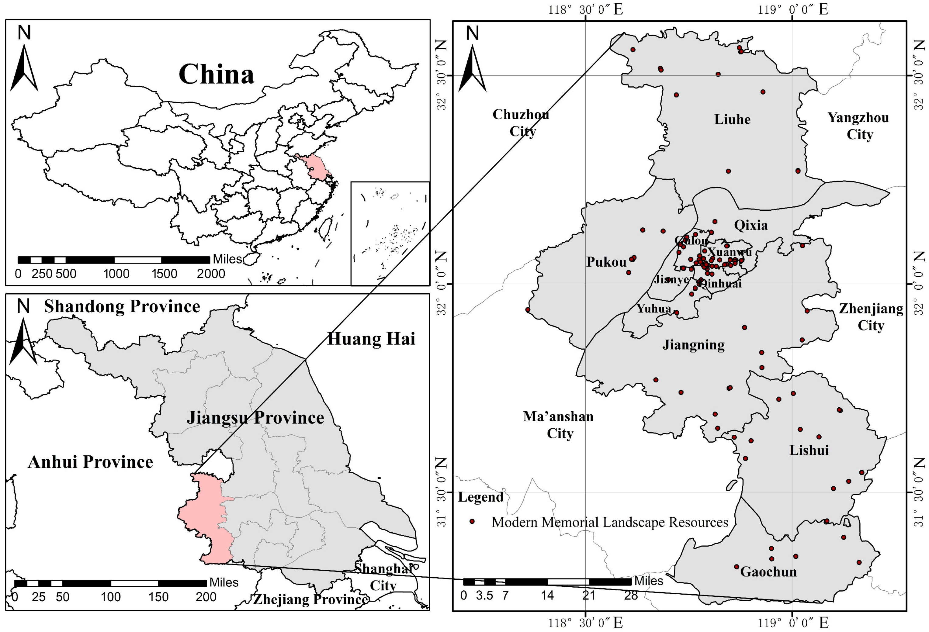 Figure 1. The location map of Nanjing City and a distribution map of modern commemorative landscapes within Nanjing.