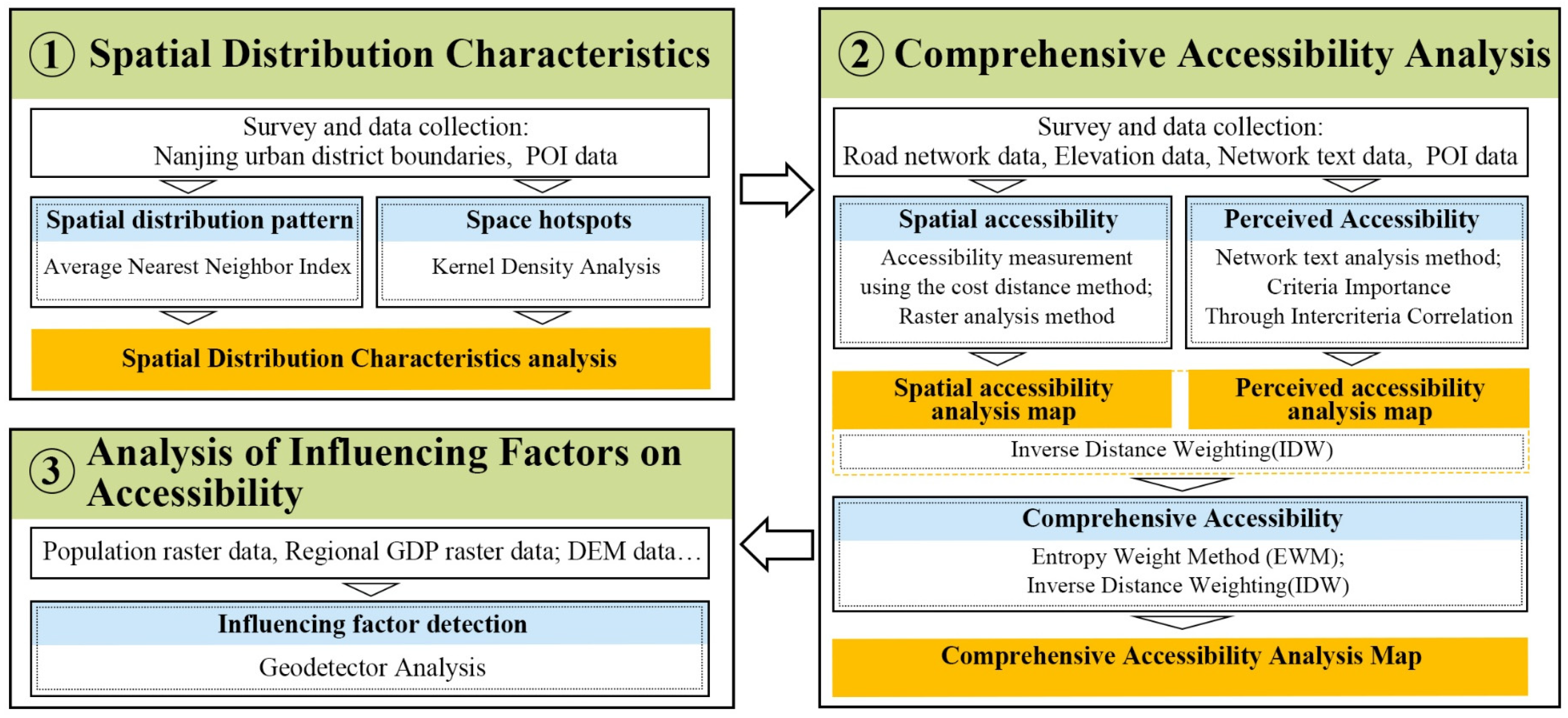 Initially, a geographic database was constructed using POI data to compile and process foundational information on modern and contemporary commemorative landscape resource points in Nanjing. Subsequently, the Average Nearest Neighbor Index was then applied to analyze spatial distribution patterns and identify whether the landscapes were clustered or dispersed. To further examine spatial distribution density, Kernel Density Analysis was employed to reveal the distribution pattern characteristics of the studied landscapes. Next, transportation network data were integrated for raster analysis and cost distance modeling to measure spatial accessibility, whereas network text data were used to assess perceived accessibility. The two accessibility measures were then combined to produce comprehensive results. Finally, the Geographical Detector tool was employed to explore the factors contributing to accessibility disparities among the studied landscapes. This process established a complete research framework encompassing the sequence of “Data Preparation—Distribution Pattern Analysis—Density Feature Analysis—Accessibility Assessment—Influencing Factor Detection”. (See Figure 2 for the research framework).