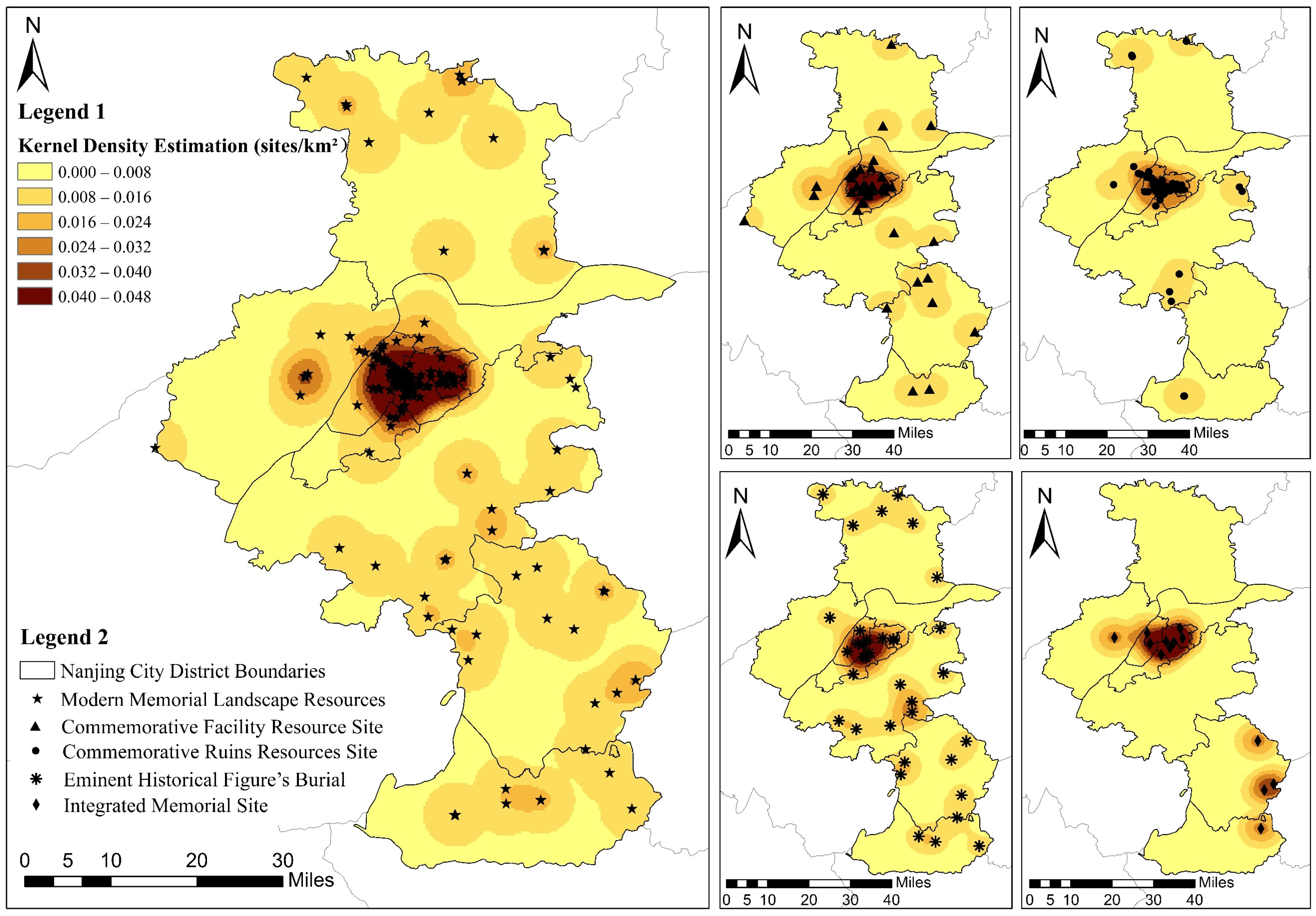 Various types of landscapes exhibit markedly differentiated spatial distribution characteristics. Commemorative facilities form high-density clusters in the main urban districts of Xuanwu, Gulou, and Qinhuai, particularly in the Xinjiekou-Meiyuan Xincun-Daxinggong area where kernel density values ranged from 0.024–0.048, reflecting the agglomeration effects of political-cultural centers. Meanwhile, suburban areas such as Taishan Street in Pukou District show localized secondary clusters. Commemorative sites are distributed along the historical-cultural axis of Changjiang Road-Zhongshan East Road, with kernel density values between 0.008–0.032, exhibiting strong spatial correspondence with Republic-era architectural clusters, though some form isolated medium-density points in areas like Maigaoqiao in Qixia District owing to in situ preservation requirements of historical events. Eminent burial landscapes exhibit a “dual-core” pattern, with the highest kernel density (0.024–0.048) around Yuhuatai Martyrs Cemetery and secondary density cluster in the Ganjiaxiang-Yaohuamen area of Qixia District. These distributions are significantly influenced by topography, with medium-low density areas predominantly distributed in hilly regions such as Purple Mountain and Niushou Mountain. Integrated memorials exhibit a prominent “core-periphery” characteristic, with the Sun Yat-sen Mausoleum Scenic Area and the Memorial Hall of the Victims in Nanjing Massacre by Japanese Invaders forming extreme high-density cores exceeding 0.048, while overall displaying a “few but large” distribution pattern with low-density areas accounting for 78% of the total area. Overall, the spatial distributions of Nanjing’s modern commemorative landscapes follow a typical “core-periphery” model, with high-density clusters in the main urban area and sparse distribution in suburban regions. This pattern not only reflects Nanjing’s spatial characteristics as a historical-cultural city but also illustrates differentiated distribution patterns across commemorative landscape types, influenced by multiple factors including political-cultural forces, historical events, and topographic conditions.
