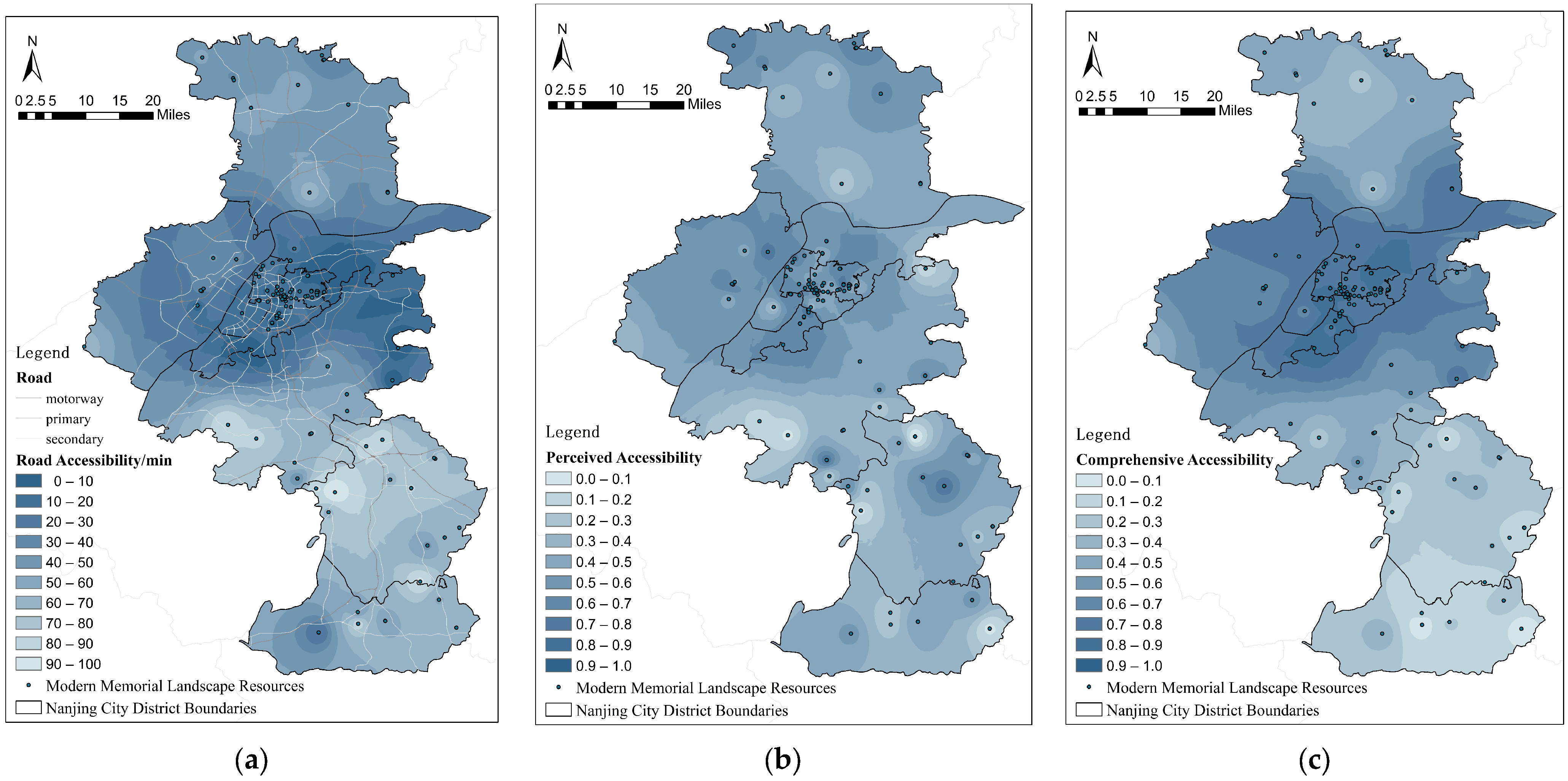 Figure 4. Analysis of overall accessibility spatial pattern of modern commemorative landscapes in Nanjing ((a). Spatial Accessibility Analysis; (b). Perceived Accessibility Analysis; (c). Comprehensive Accessibility Analysis).