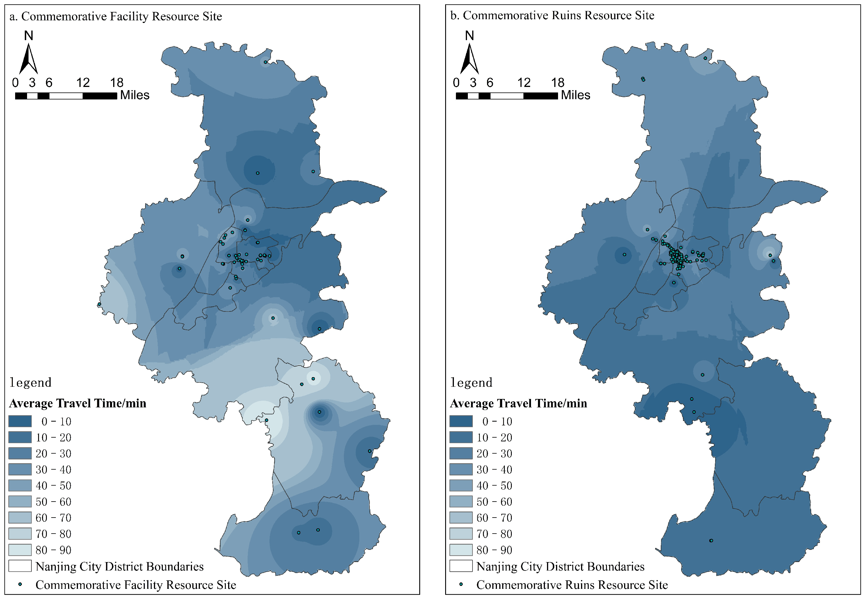 Commemorative Ruins Resources in Nanjing exhibit a spatial differentiation pattern of generally high accessibility with localized low areas. The high-accessibility centers cover nearly all major areas of Nanjing (Figure 5b), with minimum average travel times less than 0.2 h, which is primarily attributable to their proximity to major transportation networks. Limited low-accessibility areas occur in eastern Qixia District and northern Liuhe District, with average travel times of 1.0–2.0 h, forming a significant contrast with the central urban area.