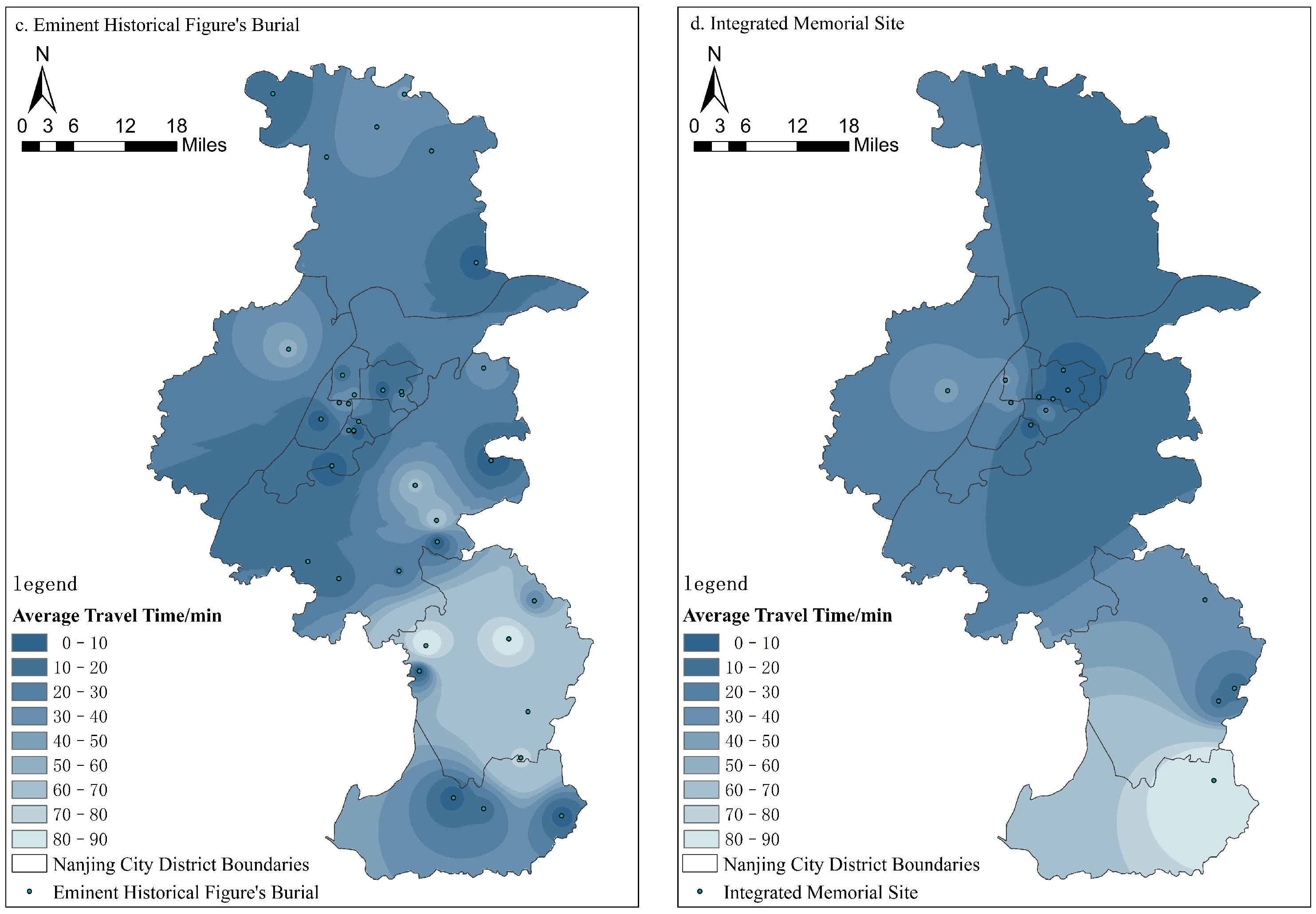 Eminent Historical Figure’s Burials demonstrate a spatial accessibility pattern characterized by central clustering with concentric diffusion. High-accessibility centers are located in Nanjing’s main urban district and resource-intensive areas (e.g., Qixia District, Yuhuatai District), where the shortest average travel times less than 0.2 h. However, significantly longer average travel times are exhibited in western Pukou and southern Jiangning districts (Figure 5c). Outer suburban areas (e.g., northern Liuhe District, southern Gaochun District) exhibit the longest average travel times (up to 2.5 h), indicating substantial regional accessibility disparities.