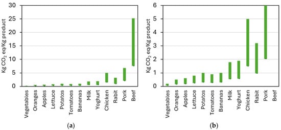 Greenhouse gas emissions per kilogram of several food products measured in carbon dioxide equivalents (CO2eq), from beginning-to-consumer based on data from [20] in two scales on y axes, from 0 to 30 (a) and from 0 to 6 (b).