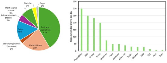Weight percentage of different types of food based on the EAT-Lancet Commission planetary health plate [25] and one example of the food required for this diet on a basis of 2500 calories per day.