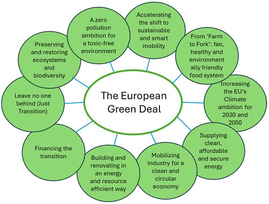 The Green Deal also pledges to “lead a global transition towards competitive sustainability from farm to fork” [69], thereby improving the environmental performance of food production as part of a broader effort to reduce the overall environmental impact of human activity (see Figure 3). Yet, despite this stated aim, the European Union has so far introduced no specific actions in the food sector, even though the Green Deal lists among its principal objectives the improvement of citizens’ well-being and health by ensuring access to healthy and affordable food while enhancing biodiversity [70].