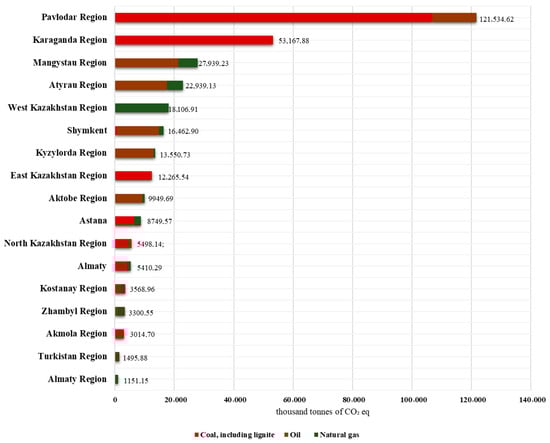 GHG emissions in the energy sector across Kazakhstan’s regions by fuel type. Source: compiled by the authors.