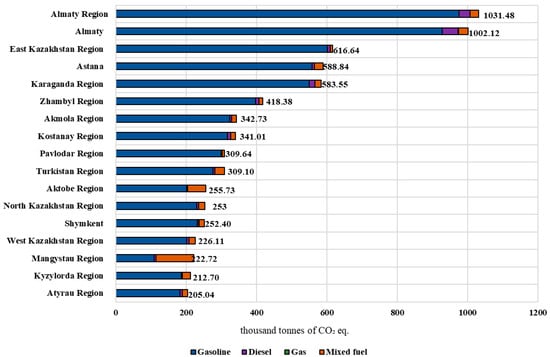 Using the coefficients from Table 5, the actual fuel consumption was computed, and emissions were estimated using Formula (2). The regional distribution of GHG emissions by fuel type in Kazakhstan is presented below (Table 6).