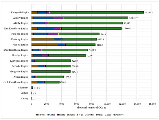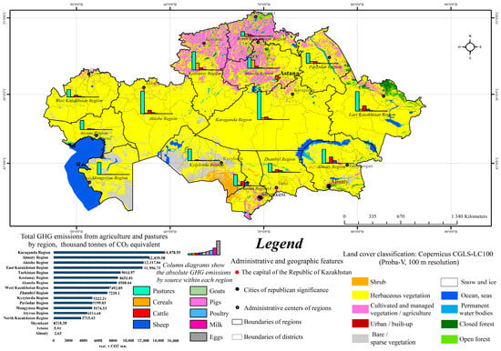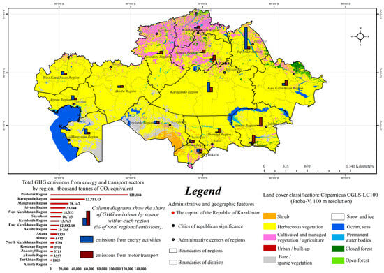 This study covers GHG emissions and sequestration across 14 administrative regions and three major cities—Astana, Almaty, and Shymkent—thereby encompassing the entire territory of Kazakhstan. With a surface area of 2,724,900 km2, Kazakhstan is the world’s ninth-largest country and the fourth-largest in Eurasia. Conventionally, five economic–geographical regions are distinguished (Table 2).