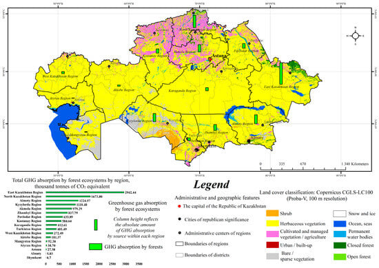 Forest ecosystems serve as the primary natural carbon sink, with East Kazakhstan showing the highest sequestration potential due to its extensive timber resources. However, the current level of absorption remains far below what is required to achieve the national reduction targets for 2030. Only northern regions come close to the conditional goal under present circumstances.