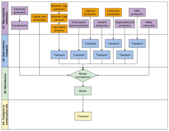 The system boundaries, presented in Figure 1, were defined according to EN 15804 [41]. The processes in orange and their respective transport are specific to the LC3 mixes. The extraction of raw materials (Module A1) includes the extraction, pre-processing, and production of each raw material, as well as electricity generation and transmission. Module A2 covers the transport of the raw materials to the production site, while Module A3 comprises the energy use during the mixing of the materials. Module A4 represents the transport of the finished mortar mix to the construction site via road transport. The use and end-of-life stages were excluded from the system boundaries due to the wide variability of mortar applications—such as masonry work, plastering, rendering, tile adhesives, concrete repair, joint filling, and grouting—where OPC consumption is typically higher than in conventional concrete and reinforced concrete [42]. Covering all potential uses of mortars would require application-specific assessments, which fall beyond the scope of this study.
