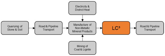 Based on these processes, the raw material extraction and processing are assigned to the sector “Quarrying of Stone & Soil”, while material transport is modeled as the “Road and Pipeline Transport” sector. The burning, grinding, and mixing fall under the “Manufacture of Non-Metallic Mineral Products” sector. The electricity is modeled with the “Electricity & District Heat” sector, while the fuel is modeled by the “Mining of Coal & Lignite” sector. A graphical representation can be found in Figure 2.