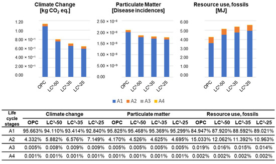 The characterized LCA results for all life cycle stages corresponding to the OPC and the LC3 mixtures for the baseline scenario are presented in Table 4.