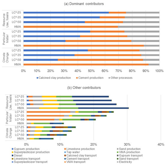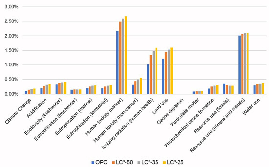 The results show significant improvement in most environmental impacts due to the decreased clinker content, with reductions ranging from 0.02% for Ozone Depletion to 44.0% for Human Toxicity (non-cancer), as shown in Table S3 (Supplementary Materials). However, Resource Use (fossils) exhibits an increase for the LC3 mixtures.