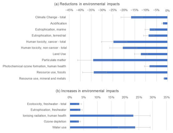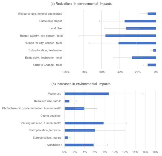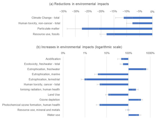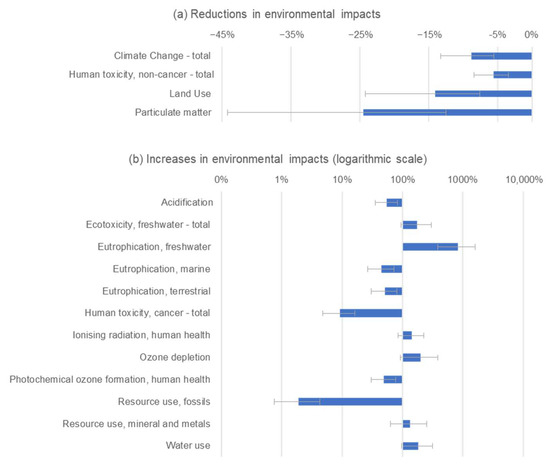 In the best-case scenario, reductions are observed only in Climate Change, Human Toxicity (non-cancer), Land Use, and Particulate Matter, while other categories increase by 1% to 1592%. In contrast, the context-specific scenario shows more moderate changes.