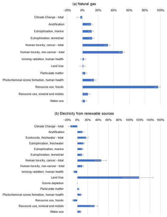 Two additional scenarios were examined, considering alternative energy sources for clay calcination: natural gas and electricity from renewable sources. The relative results are shown in Figure 9. In the natural gas scenario, only the impact category of Climate Change presented reductions (up to 7%), while other categories, such as Human Toxicity (non-cancer) and Resource Use (fossils) increased by up to 67% and 112%, respectively. For the renewable electricity scenario (via electric kiln), Climate Change, Ionizing Radiation, and Resource Use (fossils) were reduced by up to 17%, 8%, and 10%, respectively. However, several impact categories increased substantially, such as Human Toxicity (cancer) (up to 56%) and Land Use (up to 146%).