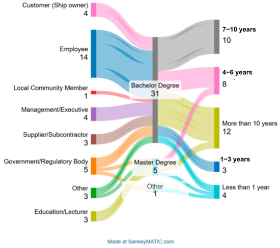 The sample size (n = 37) is justified for multiple reasons. This study emphasises depth of understanding rather than statistical generalisability, concentrating on acquiring comprehensive qualitative data from marine stakeholders. Secondly, the sample attains representation across all eight designated stakeholder categories, guaranteeing thorough ecosystem coverage. Third, topic saturation was achieved during analysis, since no new essential themes emerged in the final responses. The sample size aligns with similar stakeholder perception studies in infrastructure development and marine policy, which generally encompass 25–50 participants when employing mixed-methods approaches prioritising qualitative findings.