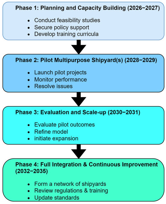 Building on the hybrid idea, some academics have suggested models that utilise underused or existing infrastructure for sustainable maritime uses, and have proposed converting idle ferry terminals, such as Indonesia’s Kamal ferry terminal, into green ship-recycling yards [32]. This low-capital solution reduces the need for greenfield development by utilising existing port assets and incorporating specialised safe dismantling, slipways, and hazardous waste storage facilities.