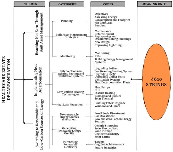 Within the green plans, sentence strings were used as meaning units of analysis [60], focusing on sustainability commitments that were either already implemented or planned. A thematic content analysis of the documents was conducted by developing conceptual models based on codes and themes identified in these strings. In total, 16,123 units were identified that were divided into five broad decarbonization themes—Estates and Facilities, Travel and Transport, Supply Chain and Procurement, On-Site Medicine and Medical Gases Usage and Organizational Change. Four of these categories are in line with the areas of carbon emissions outlined in ‘Delivering a Net Zero National Service’ [14], whilst the category ‘Organizational Change’ was included to cover the organizational structures that trusts had developed to achieve implementation of the strategies. This paper focuses on the theme of Estates and Facilities and covers 4610 strings. The conceptual model for this paper is outlined in Figure 1.