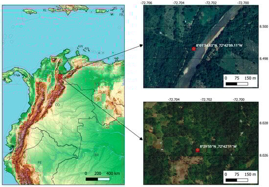 According to the coordinates of the studied farms, the soils corresponded to the IGAC cartographic units UCS_152 for Zulia and UCS_988 for Tibú, which described the soils as follows: Zulia soil (Figure 1) comprised deep, well-drained soils with clay loam to sandy loam textures. They exhibited low to high natural fertility, occurred under moderately humid climatic conditions, and were classified as Typic Dystrudepts (NS 161) [26]. Tibú soil (Figure 1) comprised soils ranging from shallow to deep, with drainage varying from good to poor. Textures included clay loam, sandy loam, and silty loam. They presented medium fertility, occurred under warm and humid climatic conditions, and were classified as Typic Udifluvents [26].