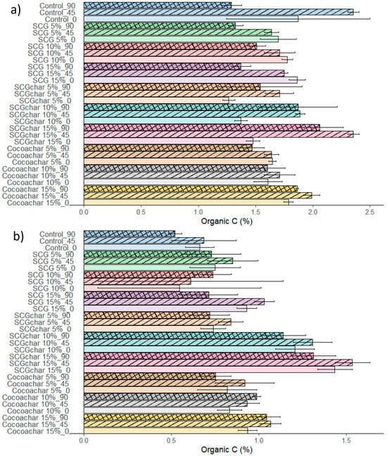 Organic C content in Zulia soil (a) and Tibú soil (b). SCGs: spent coffee grounds; SCGchar: biochar derived from spent coffee grounds; Cocoachar: biochar derived from cocoa husk.