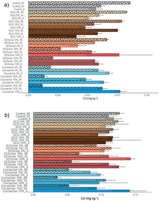 Regarding the remediation effect of SCG, our group previously reported that the addition of high doses of SCG (7.5–15%) decreased mean Cd concentrations in lettuce cultivated with this bio-residue [52]. Similarly, other studies [53] demonstrated that the addition of both SCG and SCGchar reduced Cd bioavailability in soils. Concerning cocoa husk biochar, our findings were consistent with those of Pinzón-Núñez et al. [24], who evaluated its use to reduce soil Cd. These authors observed that the application of cocoa husk biochar lowered the available Cd from 1.74 to 1.40 mg kg−1.