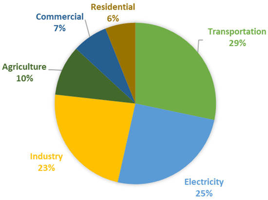 Notably, the Council of Supply Chain Management Professionals defines logistics as “part of the supply chain process that plans, implements and controls the flow and storage of goods and services between the point of origin” [27] (p. 1). In understanding the environmental effects of the supply chain process and logistics within the transportation industry, a 2017 report indicates that transportation accounts for nearly 30% of its total emissions for greenhouse gas in the United States and that this percentage had risen more than any other emissions segment in the previous two decades [28]. See Figure 1 for GHG emissions per economic sector.