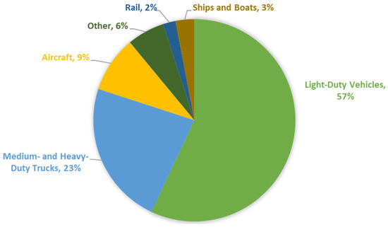 Within the transportation sector, light-duty vehicles accounted for most of the transportation portion (see Figure 2). Importantly, in 2015, the U.S. logistics industry “moved more than 49.5 million tons of goods worth nearly USD 52.7 billion every day,” as a response to significant demand for goods over long distances [25] (p. 1). This program also listed heavy-duty trucks as the fastest-growing contributor to U.S. emissions. It is projected that, by 2025, this would account for an additional 23.5% growth, potentially reaching shipments of U.S. goods to 45% [25].