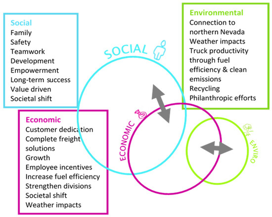 With the world population anticipated to reach nine billion people by 2050 and energy consumption expected to rise to unprecedented levels, researchers argue that the increased energy consumption will require industries to rethink their fossil fuel use, their contribution to society, and their contribution to biodiversity loss [31]. With the transport of people and goods continuing to surge, economic growth remains entangled with carbon use and its environmental impacts. Value chains cannot operate without the involvement of the transportation industry to move people and goods. Increasingly, businesses need to find new ways to do business and create new business models, and, though our study was conducted just before the start of the COVID-19 pandemic, we would be remiss if we did not acknowledge that this need for new ways was magnified during the pandemic, with major impacts on logistics processes and supply chains [32]. One model for change that businesses have explored is the triple bottom line, particularly due to calls for reductions in fossil fuel usage. However, few research studies, if any, have explored how companies with high fossil fuel usage incorporate the TBL components. Therefore, the purpose of this study was to explore how a single company with high fossil fuel usage, ITS Logistics, adapted to the TBL components of social, environmental, and economic sustainability.