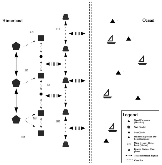 To enhance coastal defence, the Ming court established military inspection stations (Xunjiansi) at strategic coastal and island locations, coordinating these stations with Wei-Suo to accelerate response to raids. As secondary units, Xunjiansi conducted patrols and surveillance, while Shuizhai supported Wei-Suo in repelling Wokou and pirate incursions. This coordination formed the foundation for regional stability. Fujian established five Shuizhai, each responsible for a distinct sea area with overlapping coverage. Together with patrol craft from Guangdong and Zhejiang, they formed a continuous maritime defence line. Upon detecting incursions, rapid alerts mobilized adjacent Shuizhai for joint action. In this manner, Fujian maintained an integrated land–sea defence system, overseen by the Commander-in-Chief, with the three coastal defence sectors of Fujian coordinating with the five Shuizhai (Figure 12; Appendix Table A3).