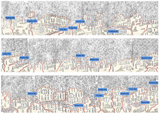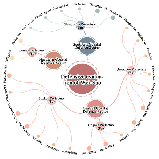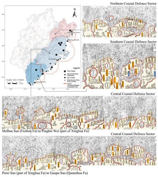 Administratively, Fujian was divided from north to south into Funing Prefecture (Zhou), Fuzhou Prefecture (Fu), Xinghua Prefecture (Fu), Quanzhou Prefecture (Fu), and Zhangzhou Prefecture (Fu). The sectoral divisions were as follows: Funing in the northern coastal defence sector; Fuzhou, Xinghua, and Quanzhou in the central coastal defence sector; and Zhangzhou in the southern coastal defence sector (Figure 5). The coastline exhibits significant spatial heterogeneity: some Wei-Suo are located on plains (e.g., Quanzhou Wei), while others are positioned in mountainous coastal terrain (e.g., Funing Wei). These environmental variations had a profound impact on defensive planning and functional roles, making terrain adaptability a critical dimension in evaluating defence effectiveness.
