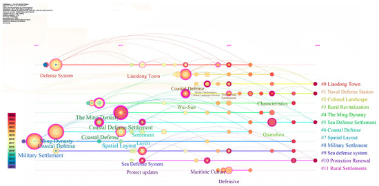 This study employed a systematic literature review and analysis approach, focusing on ancient military heritage. Using Citespace software, we analysed keywords appearing in the abstracts of relevant literature from 2000 to 2024, extracting key terms such as “coastal defence system,” “military settlement,” “spatial layout,” and “defence system” (Figure 3). Additionally, we included keywords such as research on the history of coastal defence in the Ming Dynasty and Chinese military history in our analysis. A comprehensive search of databases, including CNKI, Web of Science, Scopus, and Clarivate, identified over 100 representative academic studies, thereby establishing a robust research knowledge framework. The results indicate that research in this field can be divided into three main areas: methodology, single-disciplinary research, and multidisciplinary research.