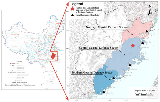 The origins of Fujian’s maritime defence can be traced back to the Qin and Han dynasties, with significant developments occurring during the Ming dynasty. In response to Wokou piracy, to enforce maritime prohibitions, and to regulate trade, the founding emperor Zhu Yuanzhang appointed Zhou Dexing, Marquis of Jiangxia, to oversee coastal defence. At key coastal positions, Zhou established five Wei citadels, thirteen Suo citadels, and sixty-seven military inspection stations (Xunjiansi), alongside five naval fortresses (Shuizhai) on offshore islands, thus creating an integrated land–sea defence system. Given Fujian’s unique geography, rich maritime defence history, and the extensive Ming garrison network, this study selects Ming-era Fujian maritime defence garrison settlements as representative samples to conduct an in-depth analysis of their defensive characteristics.