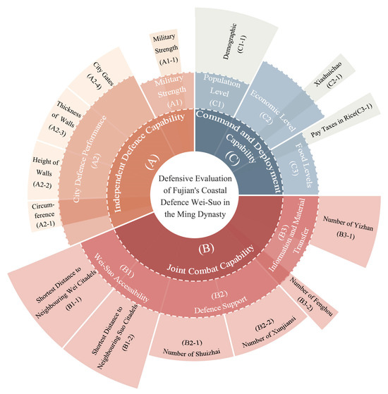 This study applies the Analytic Hierarchy Process (AHP) to quantify the defensive mechanisms of Ming-era Fujian Wei-Suo. Guided by the principles of purposefulness, parsimony, and completeness, we constructed a three-tier indicator framework (Figure 6). Independent defence capability (A) includes garrison strength and fortification characteristics (e.g., perimeter, wall height, wall thickness, and number of gates). Joint combat capability (B) considers inter-settlement accessibility, defensive support, and the transmission of information and materials. Command and deployment capability (C) reflects regional resource capacity, encompassing demographics, economic conditions, and grain reserves.